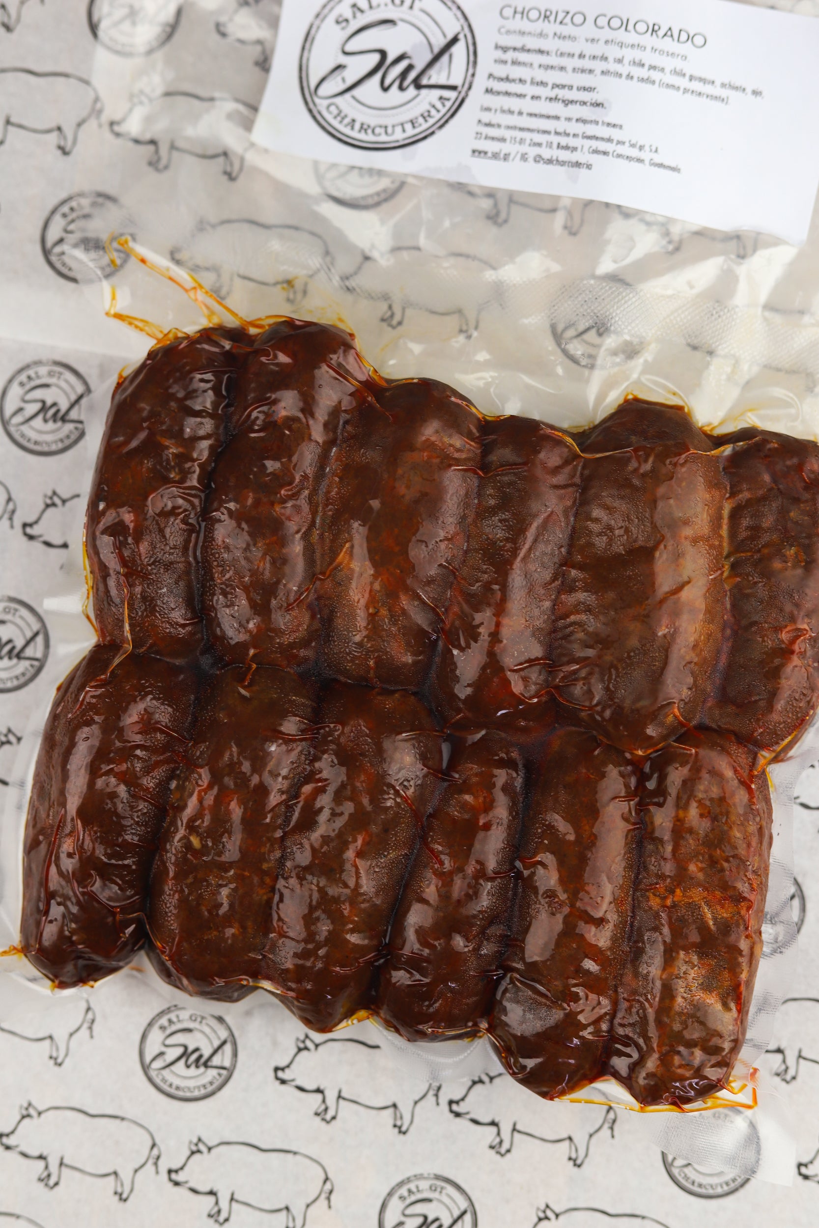 Clásico chorizo colorado, preparado con achiote y cerdo al estilo del área central de Guatemala. Producto precocido listo para rebanar.